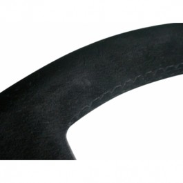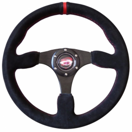 Volante desplazado de piel vuelta negra con ribete rojo y costura roja.