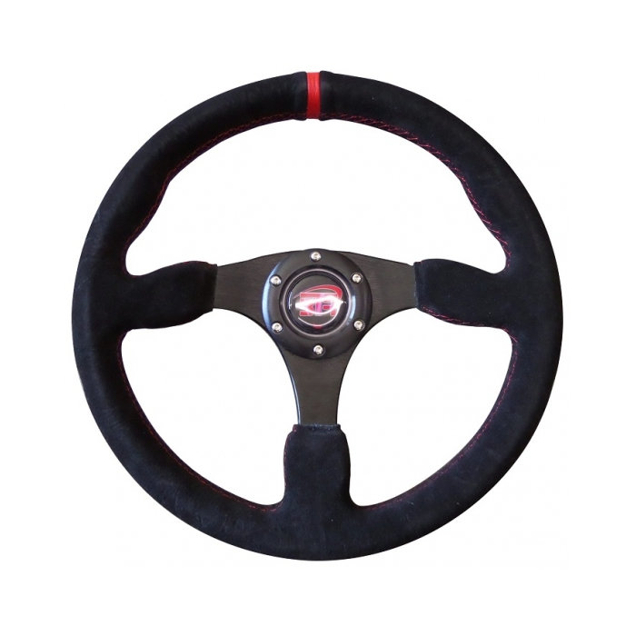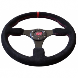 VOLANTE PLANO RACING PIEL VUELTA NEGRA, BRAZOS NEGROS, COSTURA ROJA, 350MM