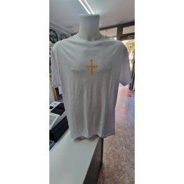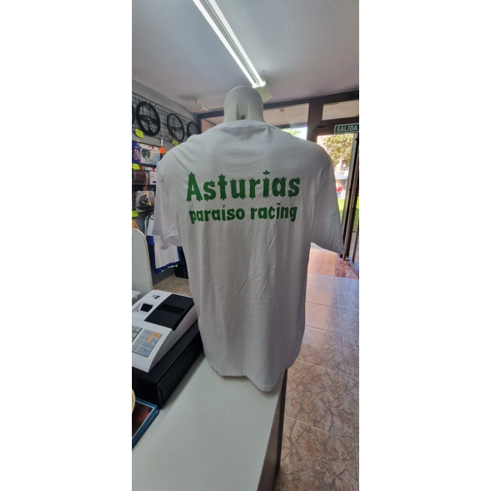 Camiseta blanca, con la cruz de Asturias y Asturias Paraiso Racing en impresión DTF en la parte delantera y trasera, de manga corta, cuello redondo y en 100% algodón. Gramaje de la camiseta 155 g/m² aprox. Se recomienda lavar en frío y planchar del revés para una mayor duración. UNISEX.