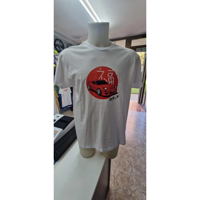 Camiseta blanca, con diseño de un RX7 en impresión DTF en la parte delantera, de manga corta, cuello redondo y en 100% algodón. Gramaje de la camiseta 155 g/m² aprox. Se recomienda lavar en frío y planchar del revés para una mayor duración. UNISEX.