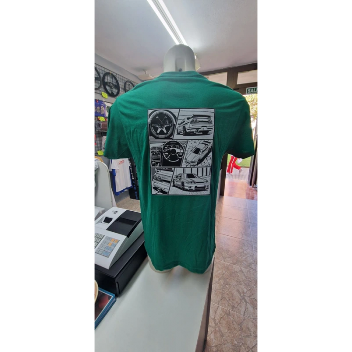 Camiseta verde, con logo JDM y GTR33 en impresión DTF en la parte delantera y trasera de manga corta, cuello redondo y en 100% algodón. Gramaje de la camiseta 155 g/m² aprox. Se recomienda lavar en frío y planchar del revés para una mayor duración. UNISEX.