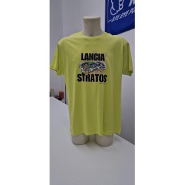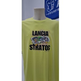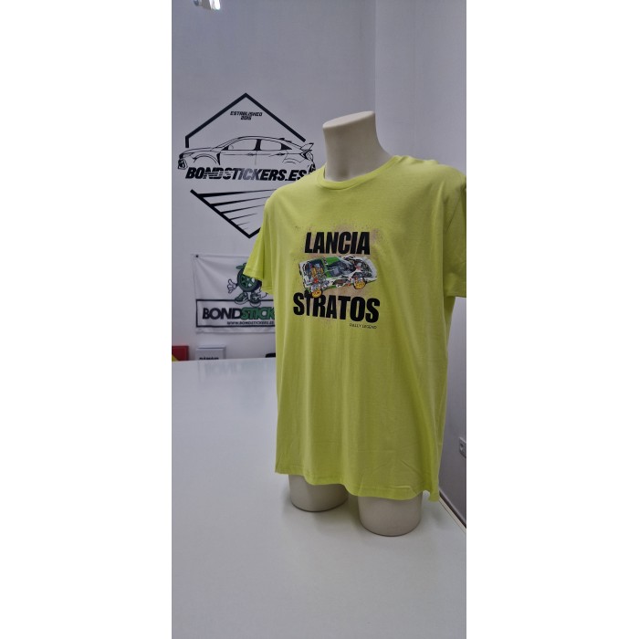 Camiseta Bondstickers amarilla verdosa, con diseño propio “Lancia Stratos” en impresión DTF tanto en la parte delantera como en la trasera, de manga corta, cuello redondo y en 100% algodón. Gramaje de la camiseta 155 g/m² aprox. Se recomienda lavar en frío y planchar del revés para una mayor duración. UNISEX.