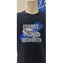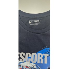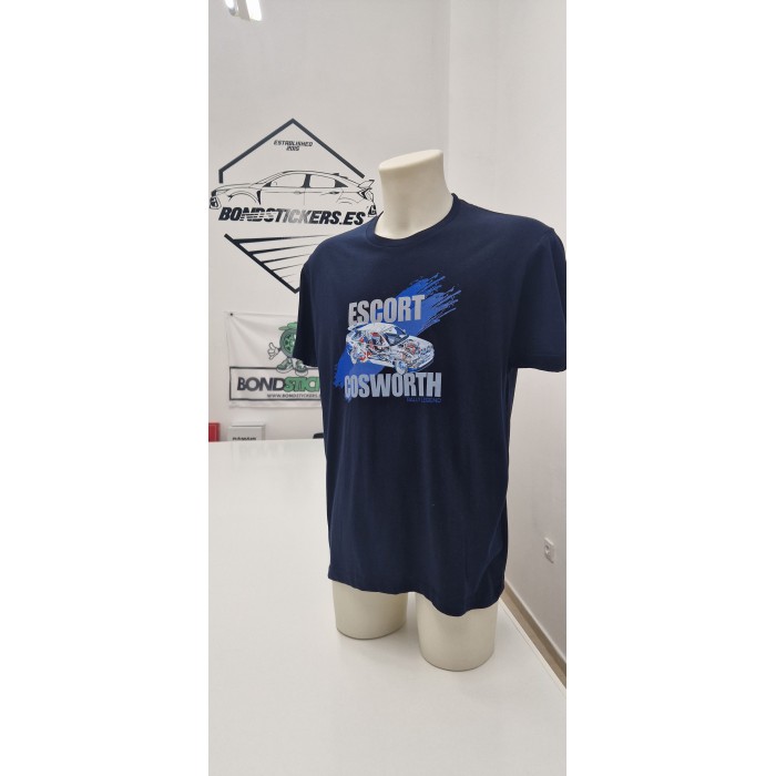 Camiseta Bondstickers azul marino, con diseño propio “Escort Cosworth” en impresión DTF tanto en la parte delantera como en la trasera, de manga corta, cuello redondo y en 100% algodón. Gramaje de la camiseta 155 g/m² aprox. Se recomienda lavar en frío y planchar del revés para una mayor duración. UNISEX.