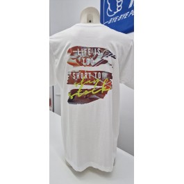 Camiseta Bondstickers blanca, con diseño propio “LIFE IS TOO SHORT TO STAY STOCK” en impresión DTF tanto en la parte delantera como en la trasera, de manga corta, cuello redondo y en 100% algodón. Gramaje de la camiseta 155 g/m² aprox. Se recomienda lavar en frío y planchar del revés para una mayor duración. UNISEX