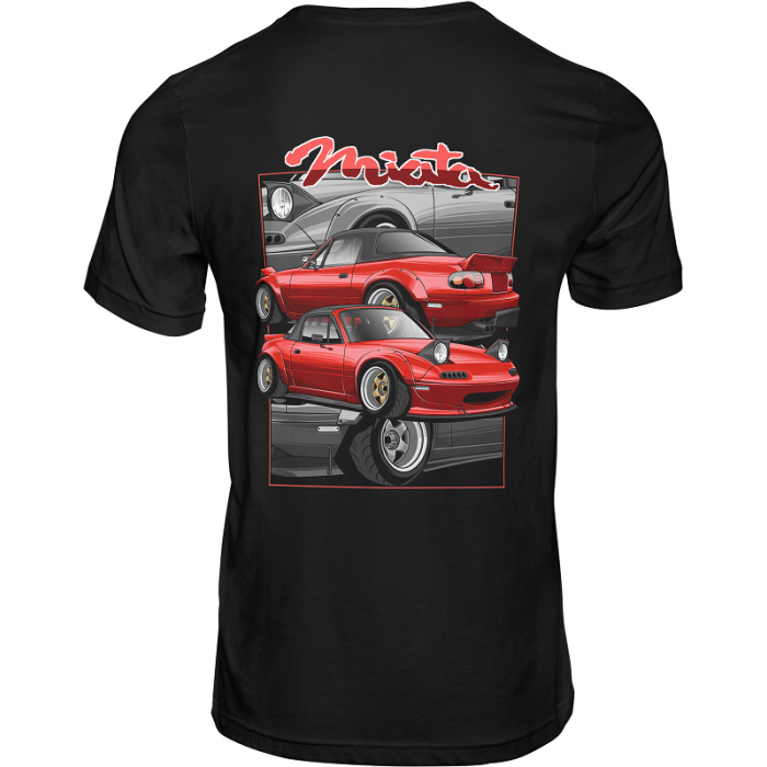 Camiseta Bondstickers negra, con diseño “Miata” en impresión DTF tanto en la parte delantera como en la trasera, de manga corta, cuello redondo y en 100% algodón. Gramaje de la camiseta 155 g/m² aprox. Se recomienda lavar en frío y planchar del revés para una mayor duración. UNISEX