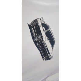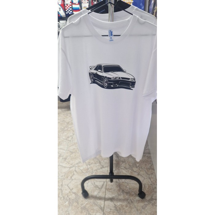 Camiseta Bondstickers blanca, con diseño de coche “Nissan Skyline R33” en impresión DTF en la parte delantera, de manga corta, cuello redondo y en 100% algodón. Gramaje de la camiseta 155 g/m² aprox. Se recomienda lavar en frío y planchar del revés para una mayor duración. UNISEX