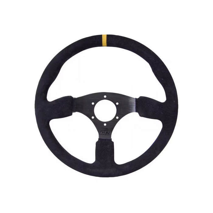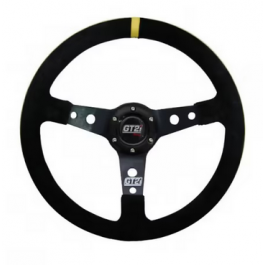 Volante plano GT2i piel vuelta. Tiene un marcador visual amarillo. Tiene 3 brazos negros anodizados. Evolución 2024 con calidad de aleación mejorada y +1 mm de grosor de aleación en los modelos planos para una rigidez perfecta. Incluye claxon. ¡Muy buena relación calidad-precio! Diámetro : 350mm Compatibilidad : piñas GT2i / OMP Desplazamiento: plano
