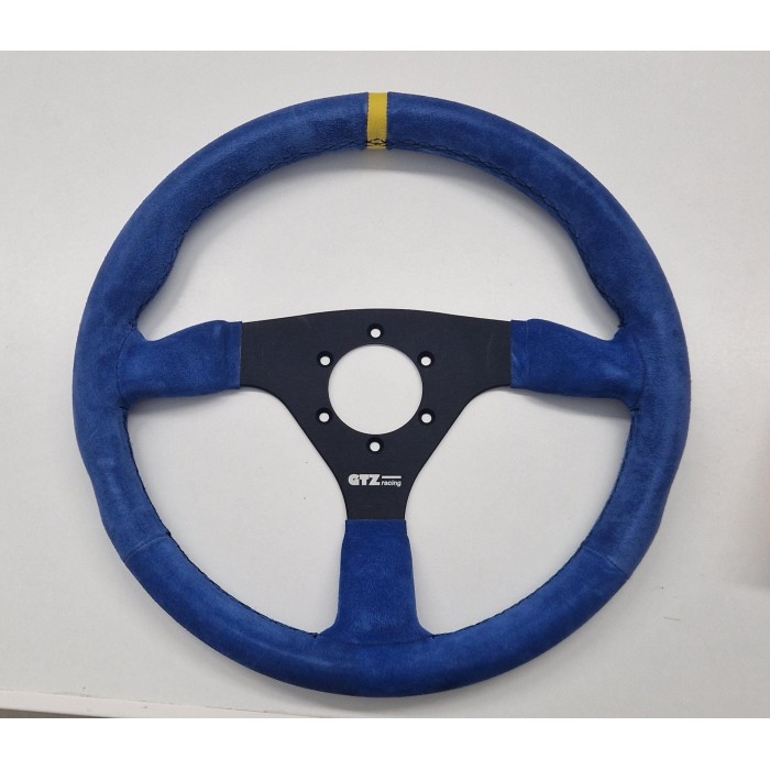 Volante plano GTZ Racing piel vuelta color azul. Tiene un marcador visual amarillo. Tiene 3 brazos negros. Incluye claxon. ¡Muy buena relación calidad-precio! Diámetro : 350mm Desplazamiento: plano