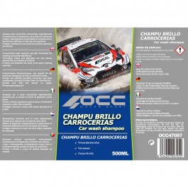 GENERAL: Si no sabes como limpiar el coche para que brille, tenemos el producto adecuado para ti. Te presentamos el champú limpiador de carrocerías "todo en uno" de 500 ml de la marca OCC Motorsport. Es uno de los mejores productos para dar brillo al coche. Una vez aplicado sobre la carrocería del automovil, se caracteriza por generar una leve capa (coating) que realza el brillo y acabado del vehículo. Aumenta el brillo del barniz, lo sella de manera rápida, lo protege consiguiendo un antiscratch, limpia en seco (suciedad moderada), es hidrofugante y se puede aplicar sobre plásticos, gomas y cristales.